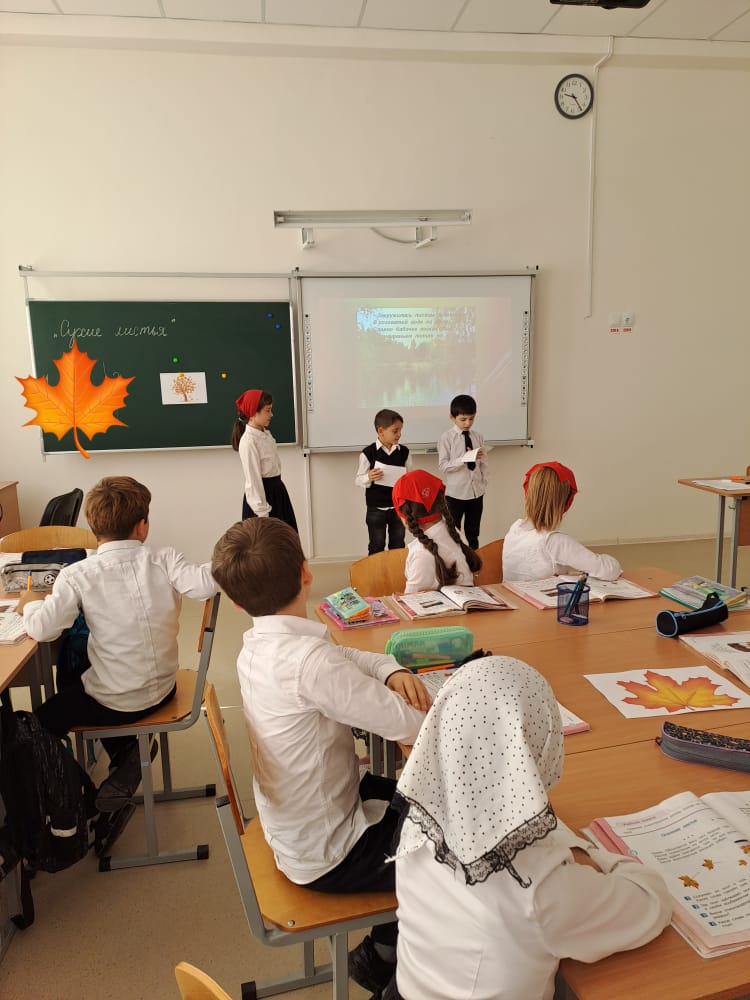 26.10.2022В рамках реализации национального проекта «Образование»федерального проекта «Успех каждого ребенка» в МБОУ “Гелдаганская СШ им. Первого Президента ЧР, Героя России А.А. Кадырова» прошел урок по литературному чтению на тему «Сухие листья» Цели: - познакомить обучающихся с произведениями разных поэтов об осени;- учить их понимать, сравнивать и выразительно читать стихи разных поэтов на одну тему;- развивать память, речь, мышление.На уроке классный руководитель 2б класса Сангириева Милана Будрудиновна познакомила учащихся с произведениями, которых объединяет одна общая тема, тема осени.Так же ребята поиграли в игру «Найди лишнее». В конверте лежали листочки с описанием листьев. И дети угадывали по описанию листья деревьев.За хорошую работу на уроке учитель подарила учащимся листочки. -Вы их дома раскрасите и на обратной стороне напишите слова, которые говорят какие листья бывают осенью прокомментировала Милана Бадрудиновна.Учитель давала только положительную характеристику результатам их деятельности, что стимулировало детей и повышало их активность на уроке. По типу это урок открытия новых знаний. На уроке применялись здоровьесберегающие технологии: физкультминутка, гимнастика для глаз. Ученики показали навыки работы в паре, способность объективно оценивать себя и своих товарищей. В течение урока прослеживались межпредметные связи с окружающим миром, литературным чтением.