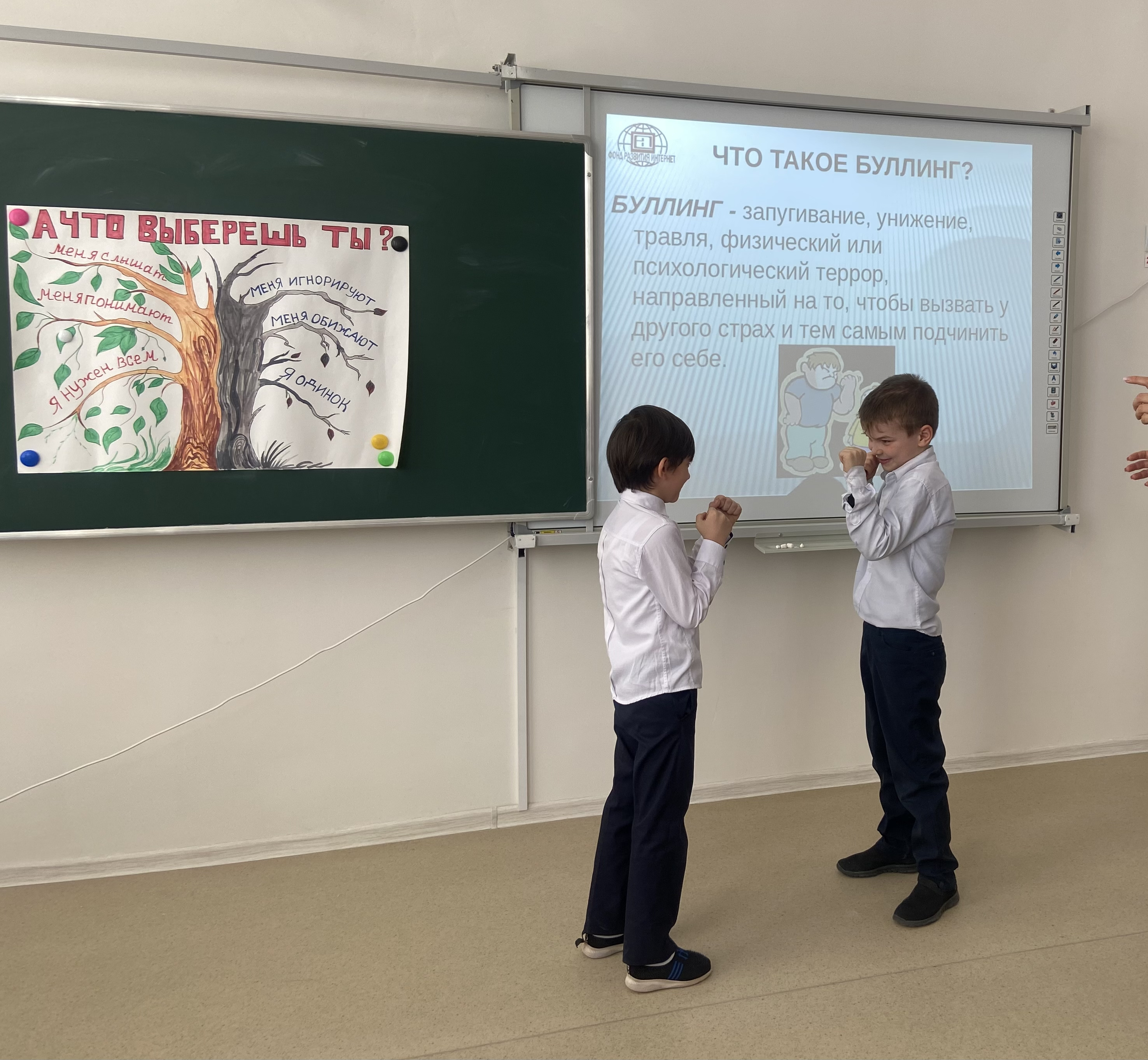 В ходе занятия учащимся было предложено создать ситуацию буллинга, также педагог-психолог дополнила ребятам что, буллинг не всегда выражается в физическом нападении. Чаще происходит психологическое насилие в форме