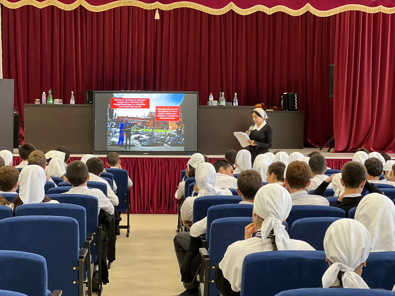 В ходе встречи с учениками 8-9 классов, сотрудники Управления рассказали, что благодаря единству и сплоченности населения страны, и несгибаемой воли духа перед лицом националистических формирований Украины, Вооруженные Силы РФ сражаются за правое дело чтобы в будущем молодое поколение людей не забывали подлинную историю нашей страны.