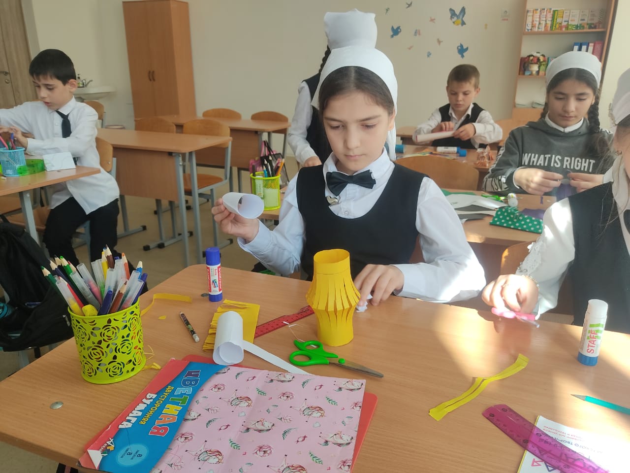 В МБОУ «Гелдаганская СШ им. А. А. Кадырова» прошло внеурочное занятие по технологии на тему «Способы получения объёма бумаги».