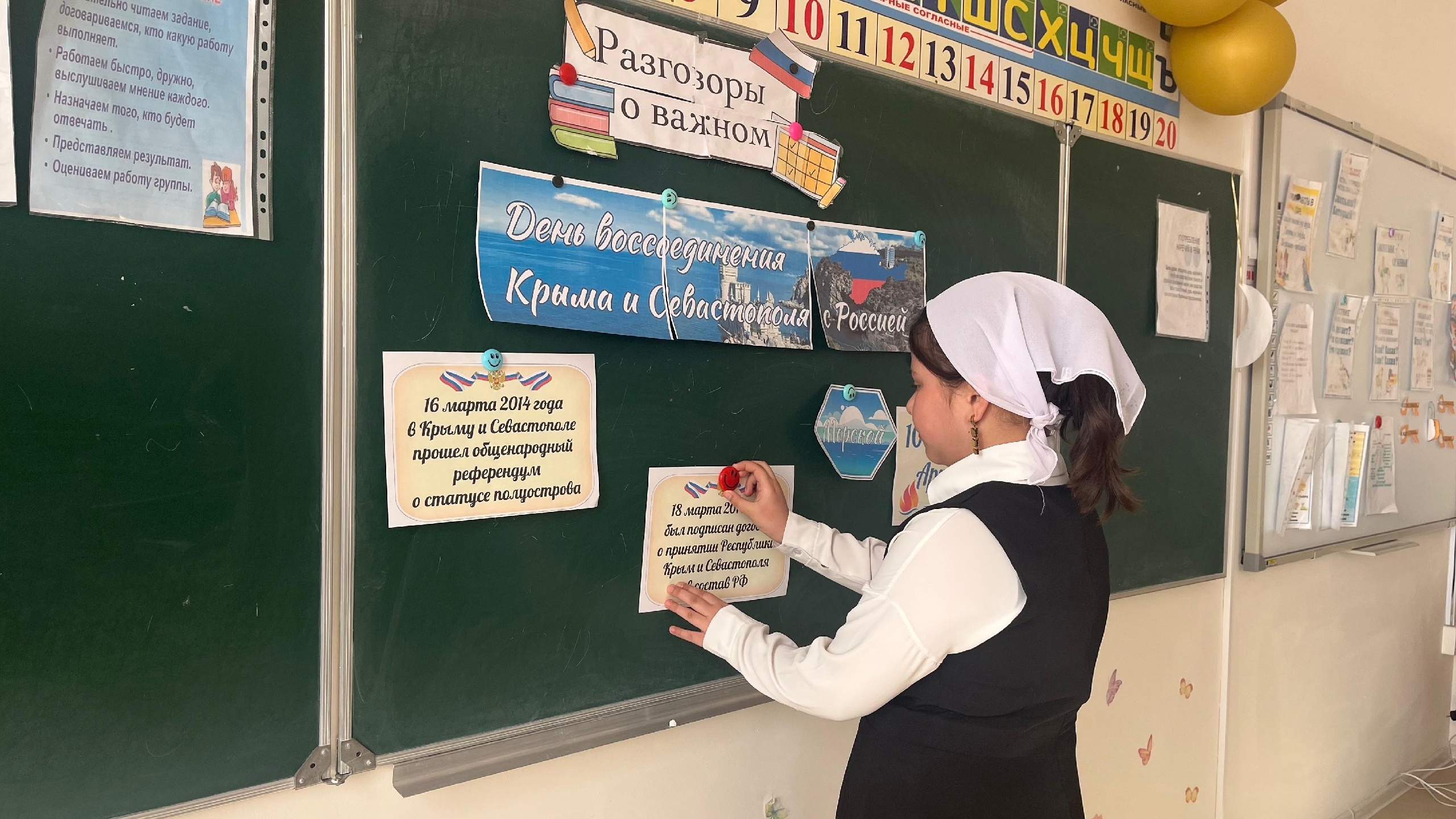 18.03.2025в МБОУ "Гелдаганская СШ им. А. А. Кадырова" прошли внеурочные занятия на тему :"Воссоединение Крыма с Россией" Это знаковое историческое событие, которое открыло новую страницу в истории России. Крым — неотъемлемая часть нашего государства, здесь находится главная военно-морская база в Чёрном море, а также Крым является одним из культурных центров России.