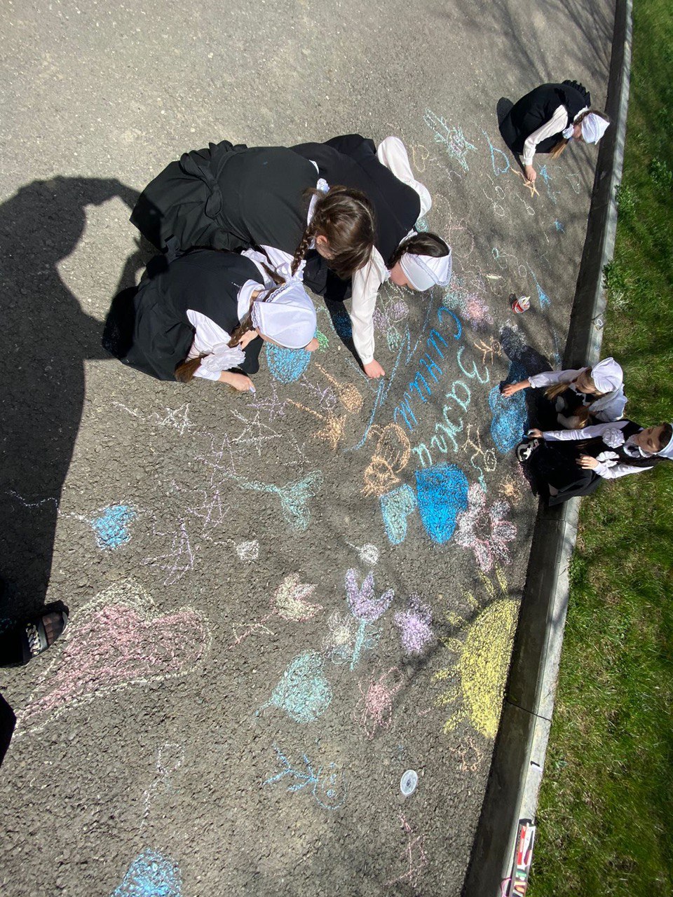 Учащиеся начальной школы МБОУ "Гелдаганская СШ им. А. А. Кадырова" приняли участие в яркой и доброй акции — рисунки на асфальте ко Дню защиты детей.
